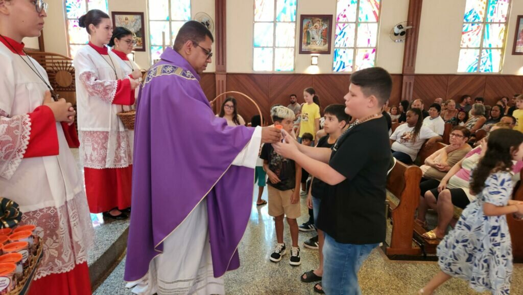 O padre ainda exortou a comunidade a celebrar piedosamente o rito do Ato Penitencial na Missa. Seja com os olhos fechados, em pé, de joelhos ou com as mãos no coração. Gestos que contribuem para a necessária participação e vivência do rito. Durante o ofertório o padre entregou para as crianças da catequese o “cofrinho da quaresma”. Nesse cofrinho as crianças irão depositar o fruto da penitência, o gesto concreto, e irão trazer na Missa de Domingo de Ramos, em 29 de março. Ao final da celebração o padre explicou o significado das cinzas e os fiéis receberam a imposição das cinzas.