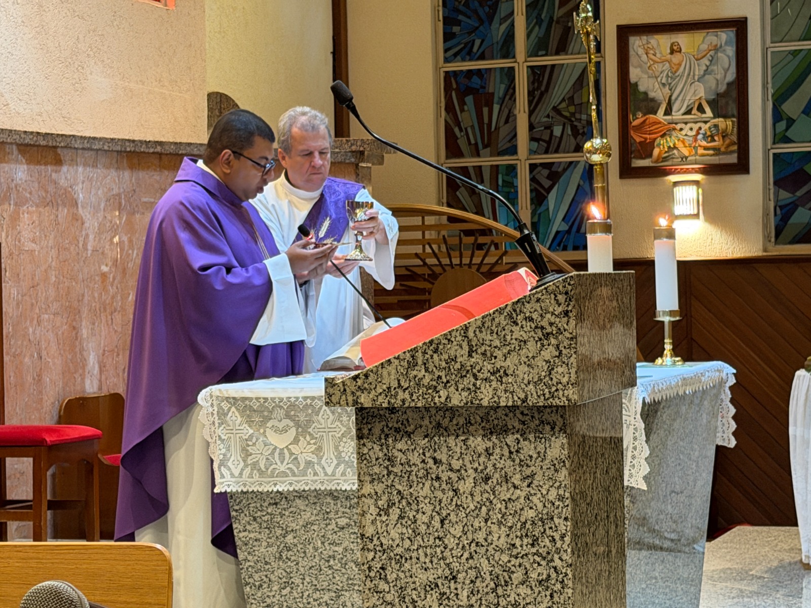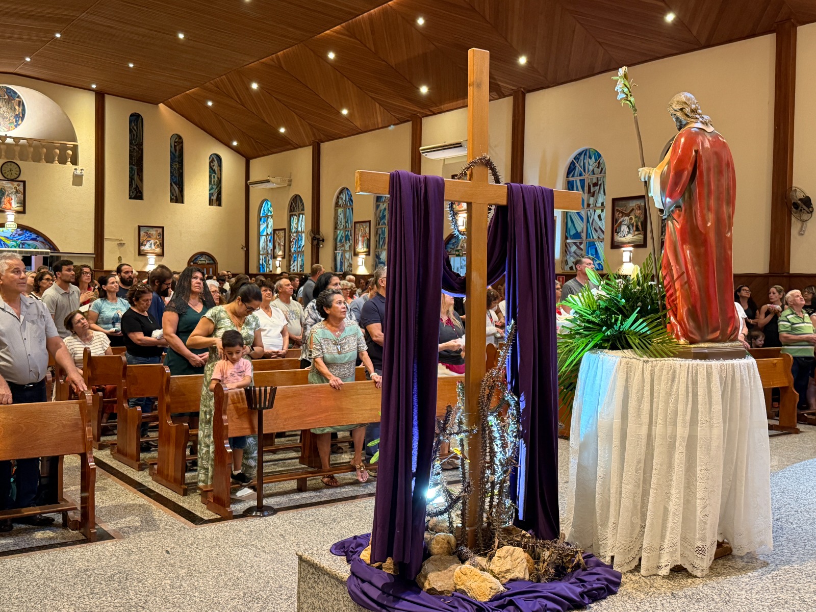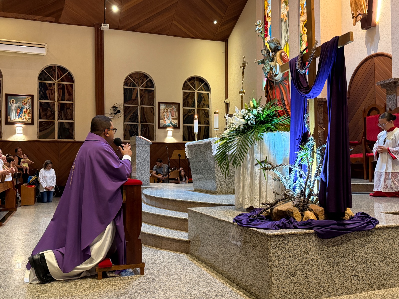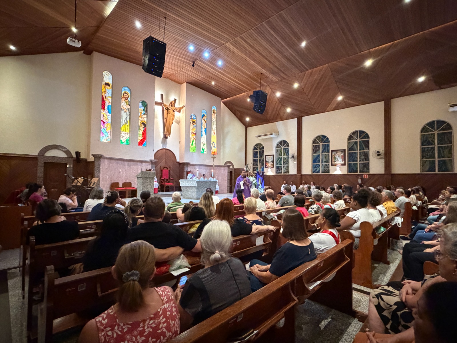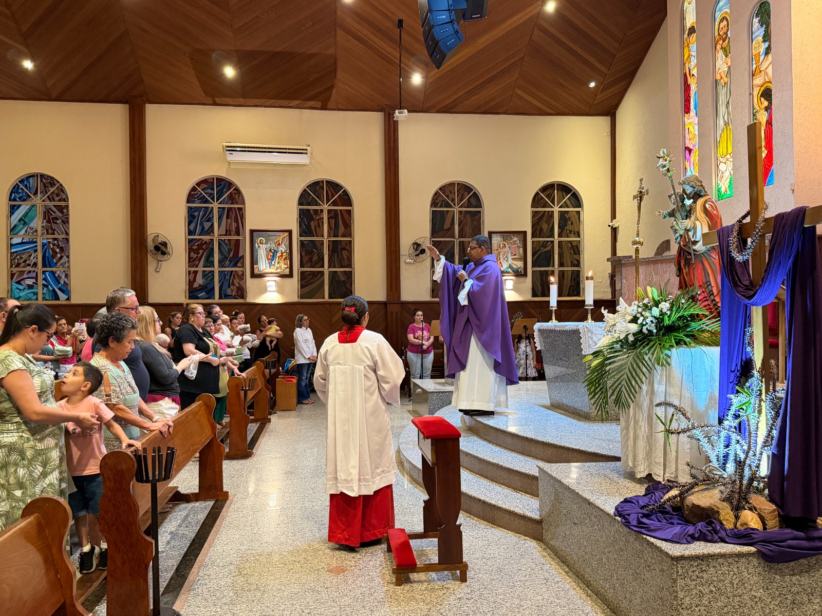 Na noite dessa segunda feira, 16 de março, centenas de fiéis devotos participaram da Santa Missa no 1º dia do tríduo em honra a São José, esposo de Maria. Os fiéis receberam uma oração de consagração a São José na entrada da igreja. Durante a celebração o Pe. Dirceu Reis, na homilia, destacou a ação de Deus na vida e no coração humano. “Deus cria uma obra nova, uma história nova e um novo coração. Nossa relação com Deus nos liberta dos ressentimentos do passado, por isso nos tornamos novas criaturas. E as enfermidades e cruzes enfrentadas na família, são motivos para buscarmos ao Senhor com a nossa oração perseverante”, disse o padre.