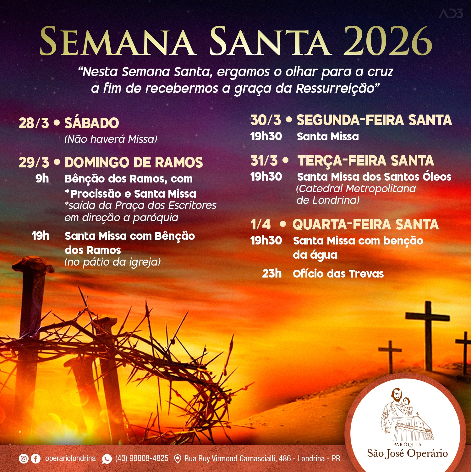 A paróquia convida todos os fiéis para viver intensamente os momentos mais profundos da fé cristã durante a Semana Santa, tempo sagrado em que recordamos a paixão, morte e ressurreição de Nosso Senhor Jesus Cristo.