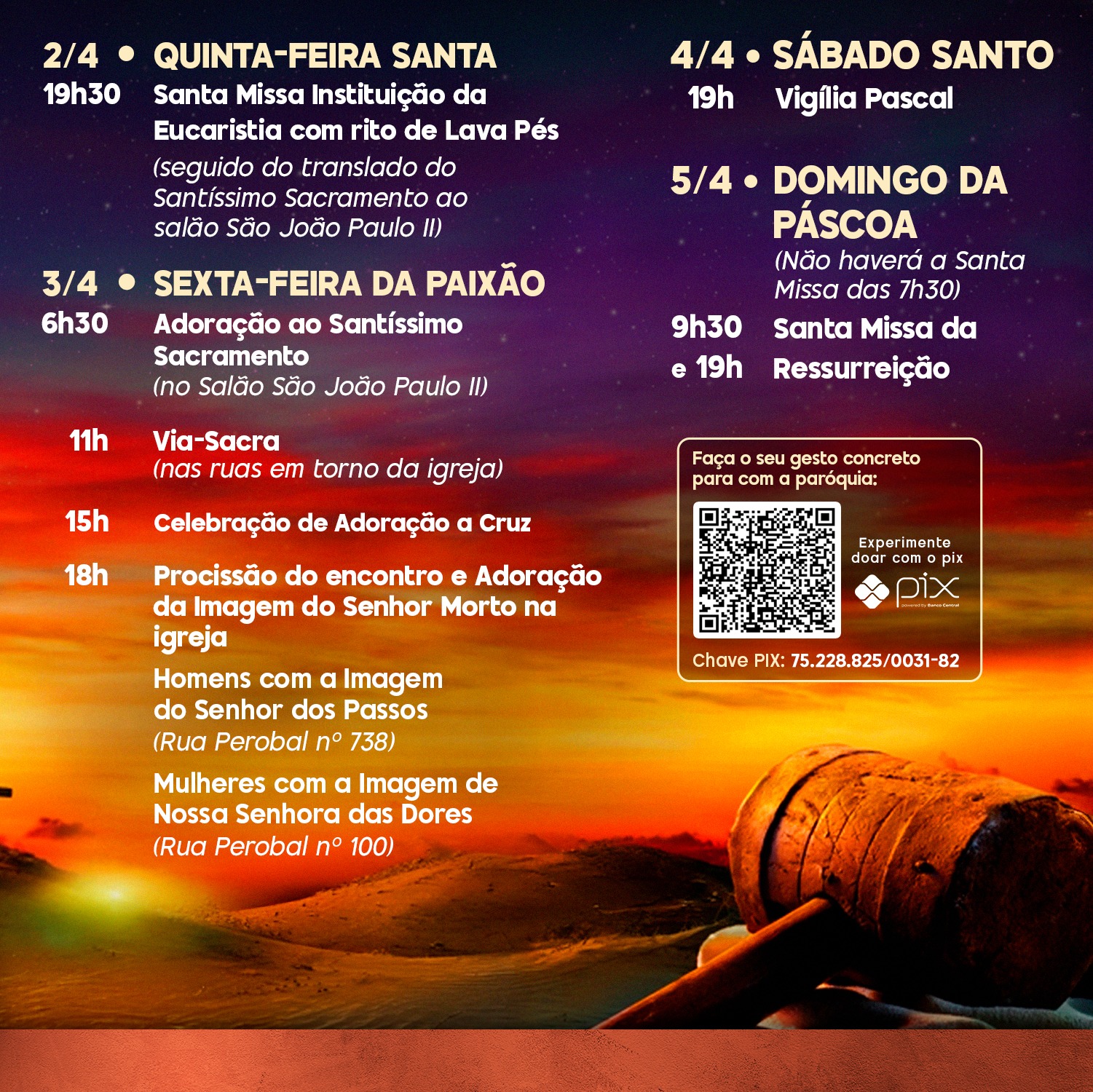 Durante este tempo de fé e renovação espiritual, os fiéis também são convidados a colaborar com a missão da paróquia por meio de doações. É possível contribuir através do PIX da paróquia.